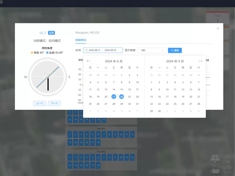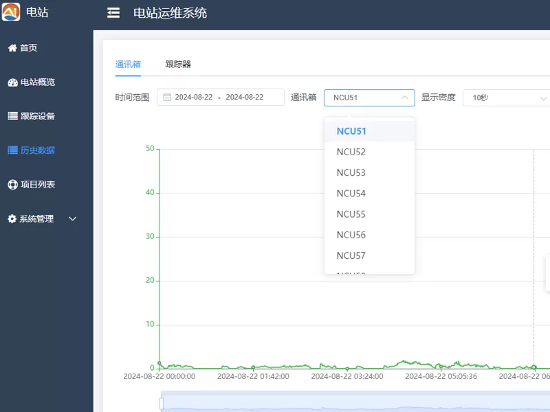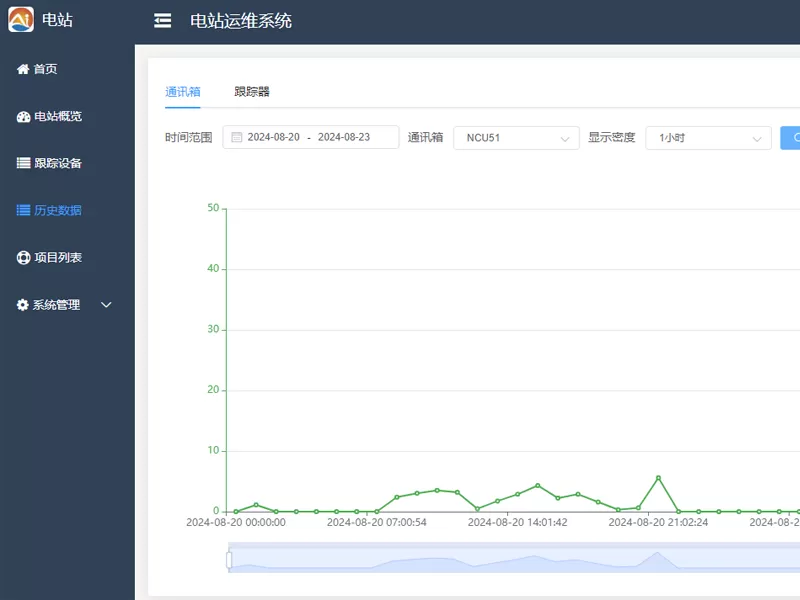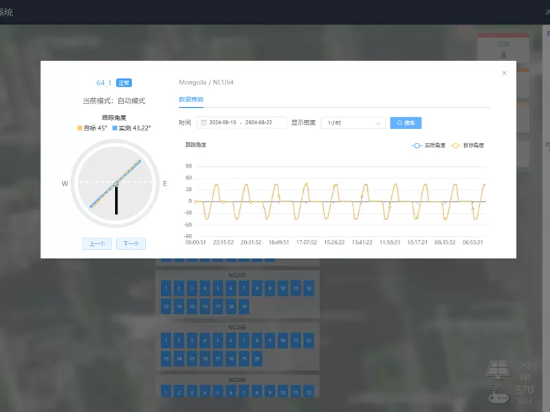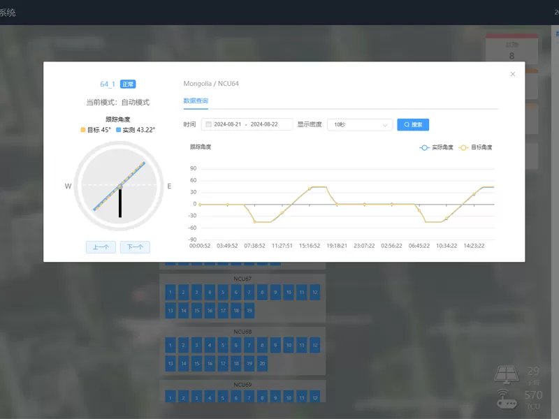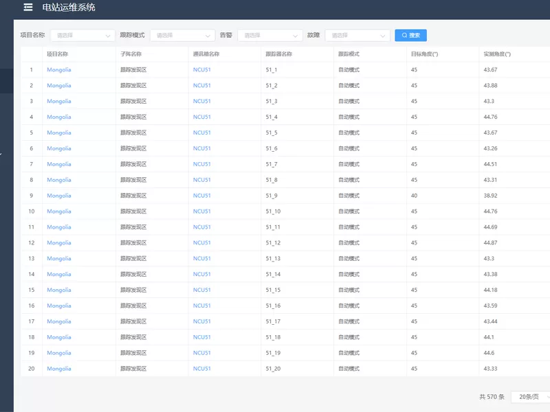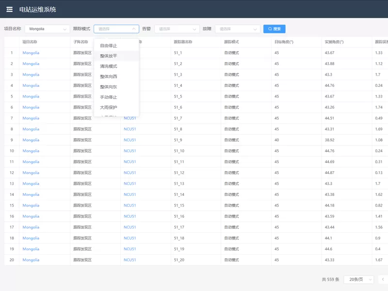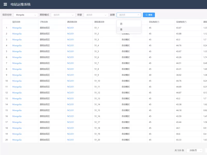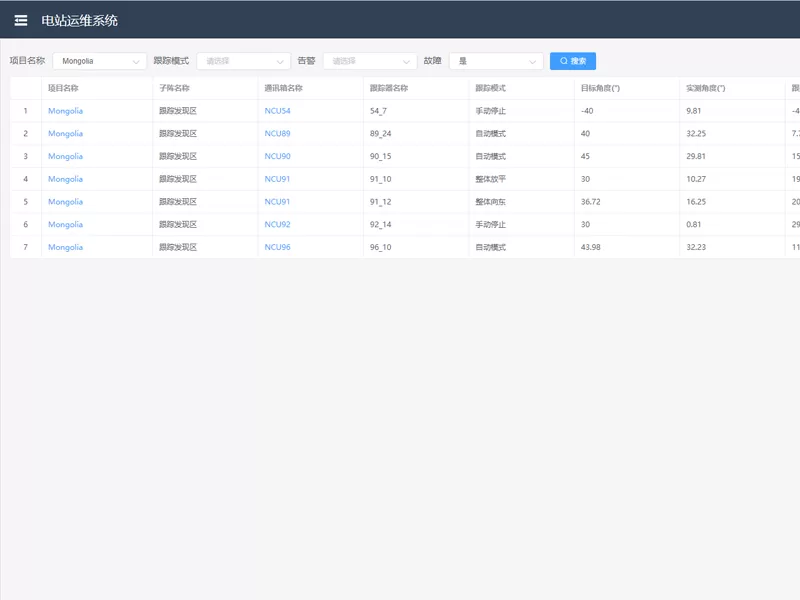 Smart dashboard visualizes key indicators like fault rate, wind speed, tracker angle, and system mode instantly.